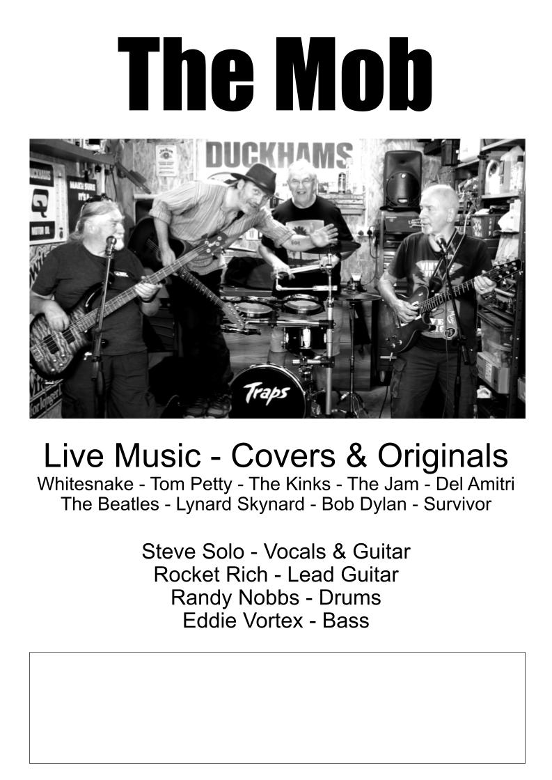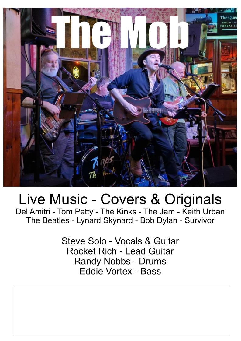 Our band performs covers from artists such as Whitesnake, Tom Petty, Keith Urban, Del Amitri, The Beatles, Lynard Skynard, Bob Dylan and Survivor. We also play a few originals written by Steve, this gives us the opportunity to be creative or make it up as we go along. We are based in South Devon and although we're getting on a bit we love to gig and enjoy evenings of live music and laughs with friends. We got all the gear and no idea 😂 between us, nearly 200 years of live music experience! We'll let you decide what Mob stands for, answers on a postcard please or just come along and have a laugh at with us. It would be good to see you!